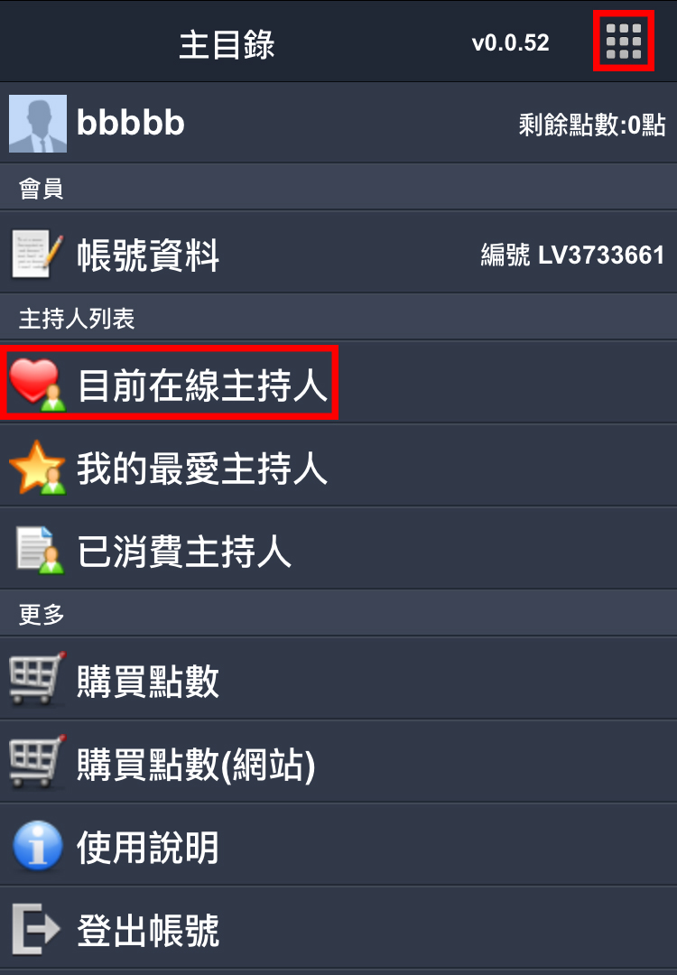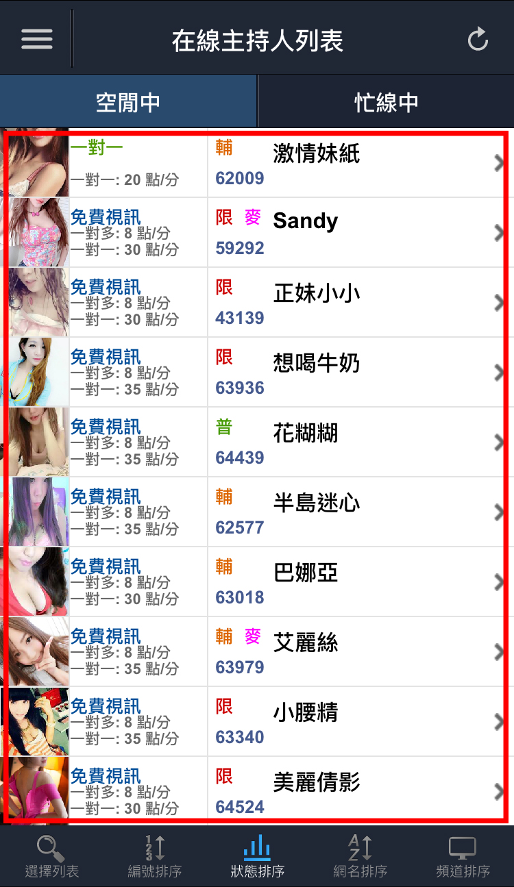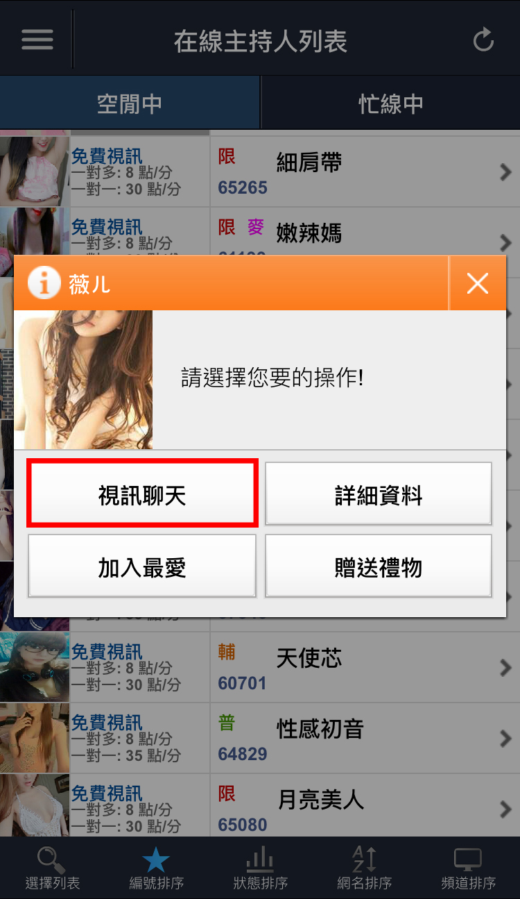 主持人列表>目前在線主持人>選擇您想聊天的主持人>點選視訊聊天>選擇一對多或一對一即可跟主持人視訊聊天。